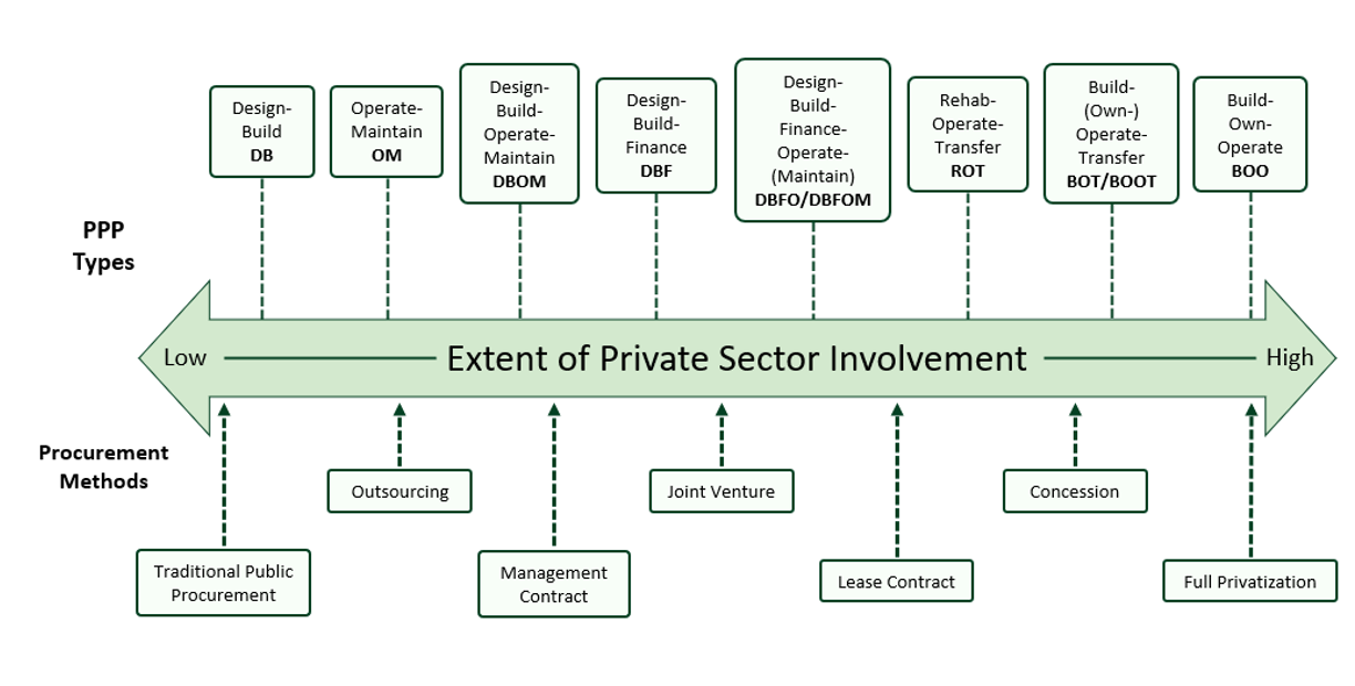 Lastly, the lack of a clear definition of PPPs can also be partly attributed to their overlap with other forms of public procurement. These forms share many close similarities, particularly in risk-sharing, service delivery and private sector involvement, adding more complexity to the distinction and definition. The next part covers this aspect and differentiates PPPs from other procurement methods.