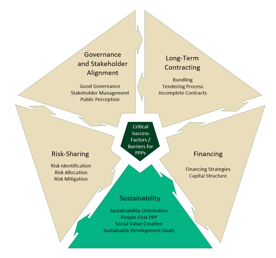 The focus lies on the detailed definition of PPP, the differentiation from other public procurement methods, an in-depth conceptualization of the key elements that constitute a PPP, the integration of sustainability considerations, and how to measure a successful PPP. While there is no clear standard definition for PPPs, they are broadly described as ‘long-term collaborative relationships between the government and private actors’, sometimes with additional elements that vary across disciplines and institutions. Many types and forms are classified under the ‘umbrella-term’ PPP that are shaped by different sectors, settings and views. The review identified five key elements for PPPs – governance and stakeholder alignment, long-term contracting, risk-sharing, financing and sustainability – each examined for its role, associated challenges and best practices underscored by some case examples. Governance is the central aspect of a PPP, as the public sector manages the long-term contract, the relationship between both partners and the stakeholders. Many types of risks are to be considered and allocated to the partner who is better able to handle them. In regards to financing, solid strategies and a firm capital structure are needed. Sustainability is of great interest to theory and practice, and a key section of the study, particularly to the three dimensions of sustainability, social value creation and the SDGs. The key elements and most best practices are interconnected in some way, as they all contribute to the success and also the sustainability of a PPP.