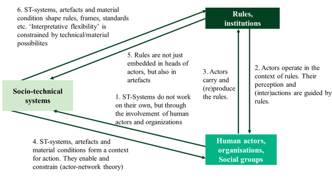 Socio-technical systems consist of material structures, technological artifacts, and infrastructural frameworks that define the scope of actors’ actions. Existing transport infrastructures, for instance, determine how easily new mobility concepts can be integrated or whether they face technical and institutional resistance. Similarly, technological artifacts such as existing production facilities in industry can slow down innovation because their conversion would require high investments. At the same time, socio-technical systems also feed back into institutional frameworks by reinforcing technological standards, norms, and routines.
