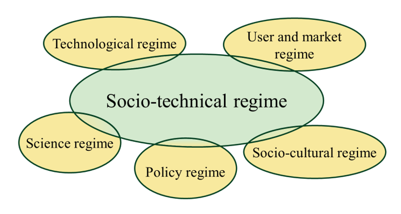 To better understand the significance of regimes in socio-technical transformations, it is first necessary to look at their theoretical foundations. The concept of the socio-technical regime in the MLP builds on the term technological regime, originally developed in innovation research8. Rip and Kemp (1998) already described technological regimes as rule sets and structures anchored in specific industries or systems: