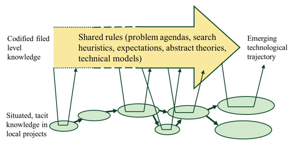 „A technological regime is the rule-set or grammar embedded in a complex of engineering practices, production process technologies, product characteristics, skills and procedures, ways of handling relevant artifacts and persons, ways of defining problems—all of them embedded in institutions and infrastructures.”(p.338)11