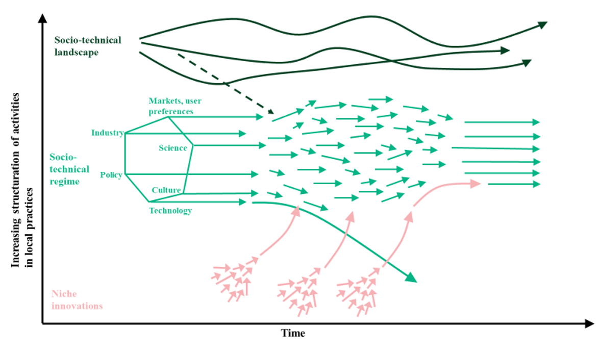 Within the MLP, regimes form the central level where socio-technical structures, institutional rules, and actor networks are stabilized over long periods of time. Their persistence is based on the interplay of technological, economic, political, and cultural factors, supported by mechanisms such as path dependencies, lock-in effects, and institutional logics. At the same time, regimes are not rigid structures. They are subject to internal tensions and gradual changes. External influences or targeted strategies by individual actors can accelerate these processes and enable profound transformations. To better understand the dynamics between stability and change, it is necessary to examine the other two levels of the MLP. The following chapter first analyzes the role of the landscape level as the broader context for regime shifts. The chapter after that then explores how niches act as sources of radical innovation and can trigger technological transformations. Finally, the interactions between these levels will be examined in detail within the framework of transition pathways.
