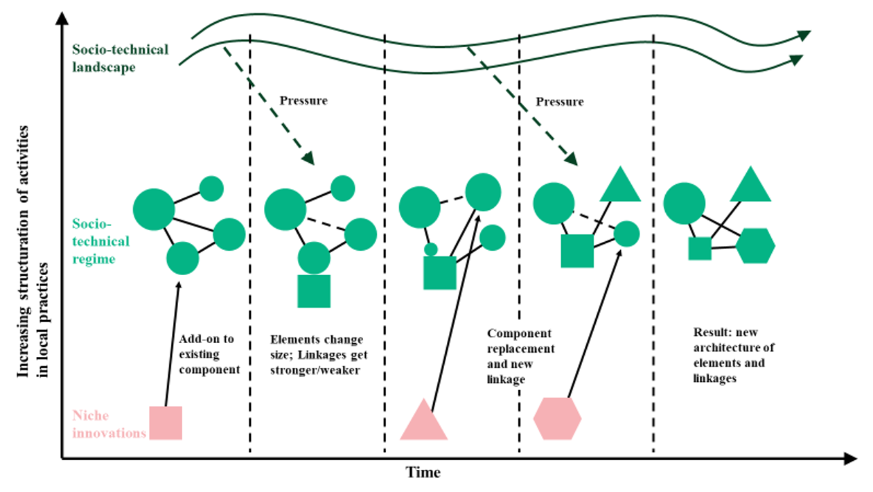 Overall, the landscape appears as a dynamic arena where long-term developments, such as environmental changes, cultural shifts, power relations, or economic disruptions, can open up new opportunities for action but also reinforce blockages10. Especially when regimes lose legitimacy or their capacity to solve problems, the acceptance of alternative niche solutions increases. Thus, the effects of the landscape are context-dependent: it can act both as a catalyst for change and as a barrier to transformation.